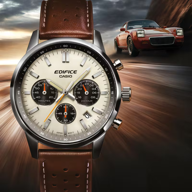 The Casio Edifice Chronograph Men’s Watch combines precision engineering with a sleek racing-inspired design. Featuring a stainless steel case, cream dial, and brown perforated leather strap, this timepiece delivers both style and performance. With chronograph functionality, date display, and 100-meter water resistance, it’s built for men who appreciate sporty elegance and dependable timekeeping. Perfect for both everyday wear and high-speed lifestyles.