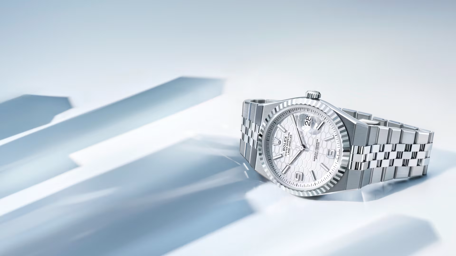 Experience timeless sophistication with the Rolex Oyster Perpetual Land-Dweller White Dial Stainless Steel Watch. Expertly crafted from premium Oystersteel, this stunning timepiece showcases a white honeycomb-pattern dial with sleek index markers and a date display at 3 o’clock. The signature fluted bezel adds a touch of Rolex heritage, while the Jubilee bracelet ensures exceptional comfort and elegance. Powered by a superlative chronometer-certified automatic movement, this watch embodies precision, durability, and luxury — making it the perfect choice for those who value refined craftsmanship and everyday elegance.