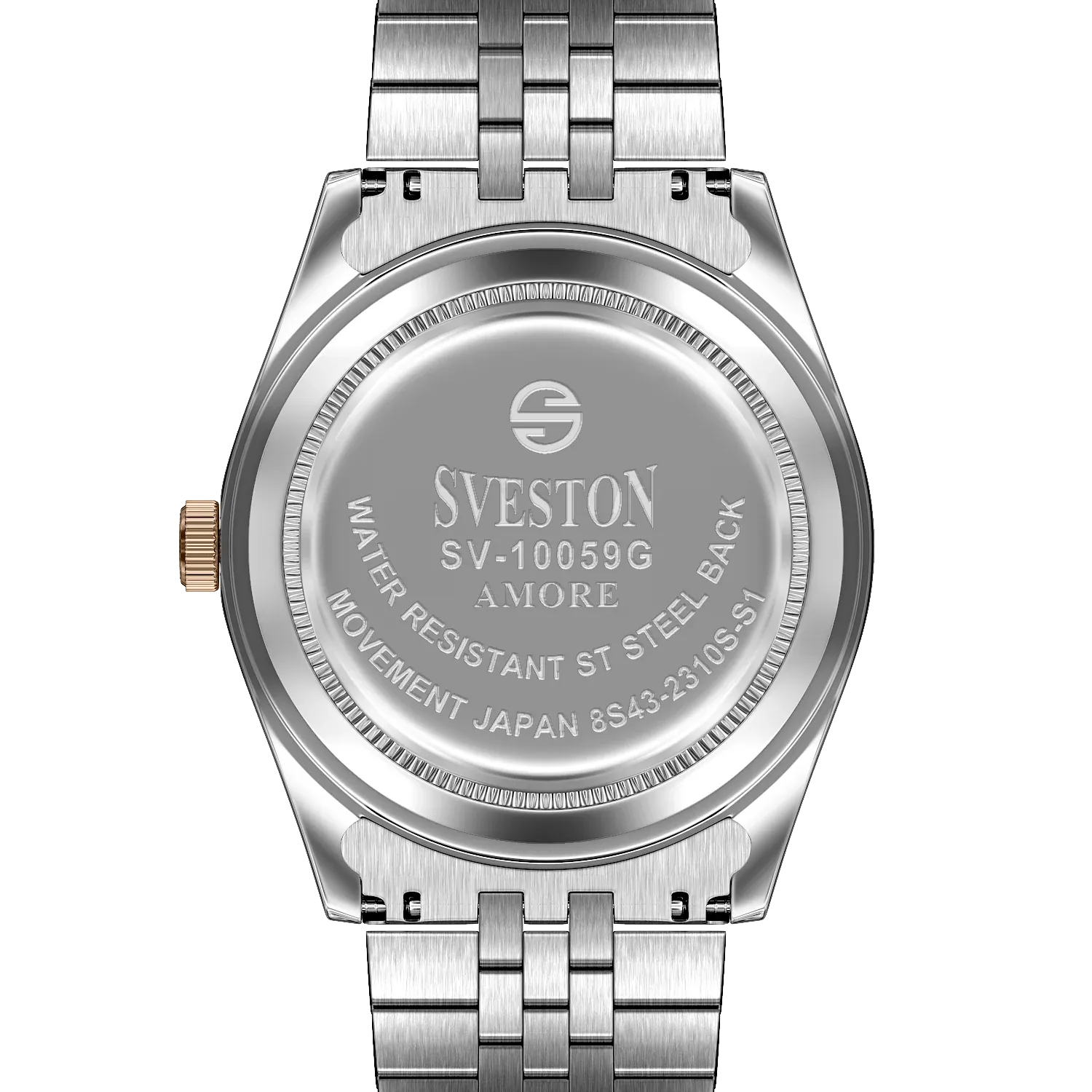 Experience timeless elegance with the Sveston Amore SV-10059, a masterpiece of refined craftsmanship. Featuring a two-tone rose gold and silver bracelet, a sparkling diamond-studded bezel, and a sleek sunray dial, this watch radiates sophistication and class. Powered by Japanese quartz movement, the Sveston Amore offers both precision and luxury, making it the perfect choice for formal events or everyday glamour.