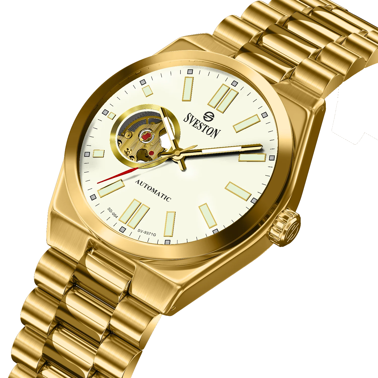 Add a touch of luxury to your style with the Sveston Automatic Gold Watch, featuring a stunning white dial and a sophisticated open-heart skeleton design that reveals precise mechanical craftsmanship. This self-winding automatic watch comes with a durable gold stainless-steel bracelet, combining elegance, performance, and durability. Perfect for formal occasions, business wear, and classy everyday looks, this Sveston timepiece defines timeless sophistication for the modern gentleman.