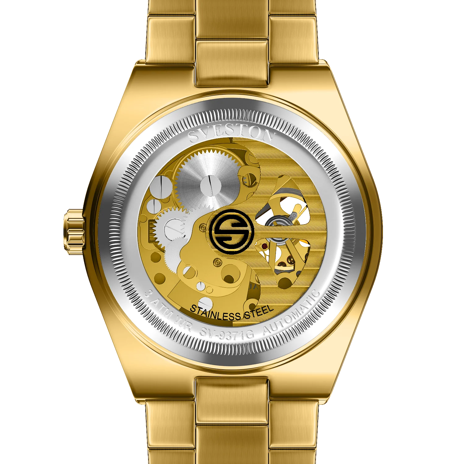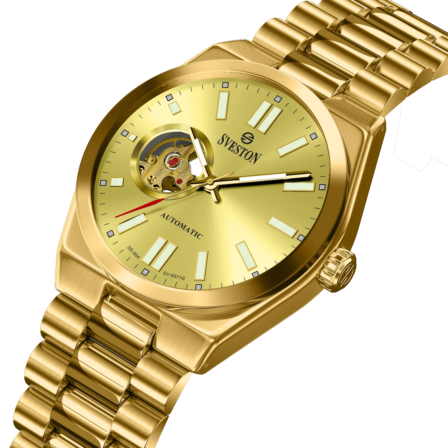 Embrace luxury and precision with the Sveston Automatic Gold Watch, a masterpiece of craftsmanship featuring a full gold-tone stainless steel body and a golden dial with an elegant open-heart skeleton design. Powered by a self-winding automatic movement, this watch delivers accuracy and style in one timeless design. Perfect for formal wear or special occasions, this luxury men’s timepiece enhances every look with sophistication and class.