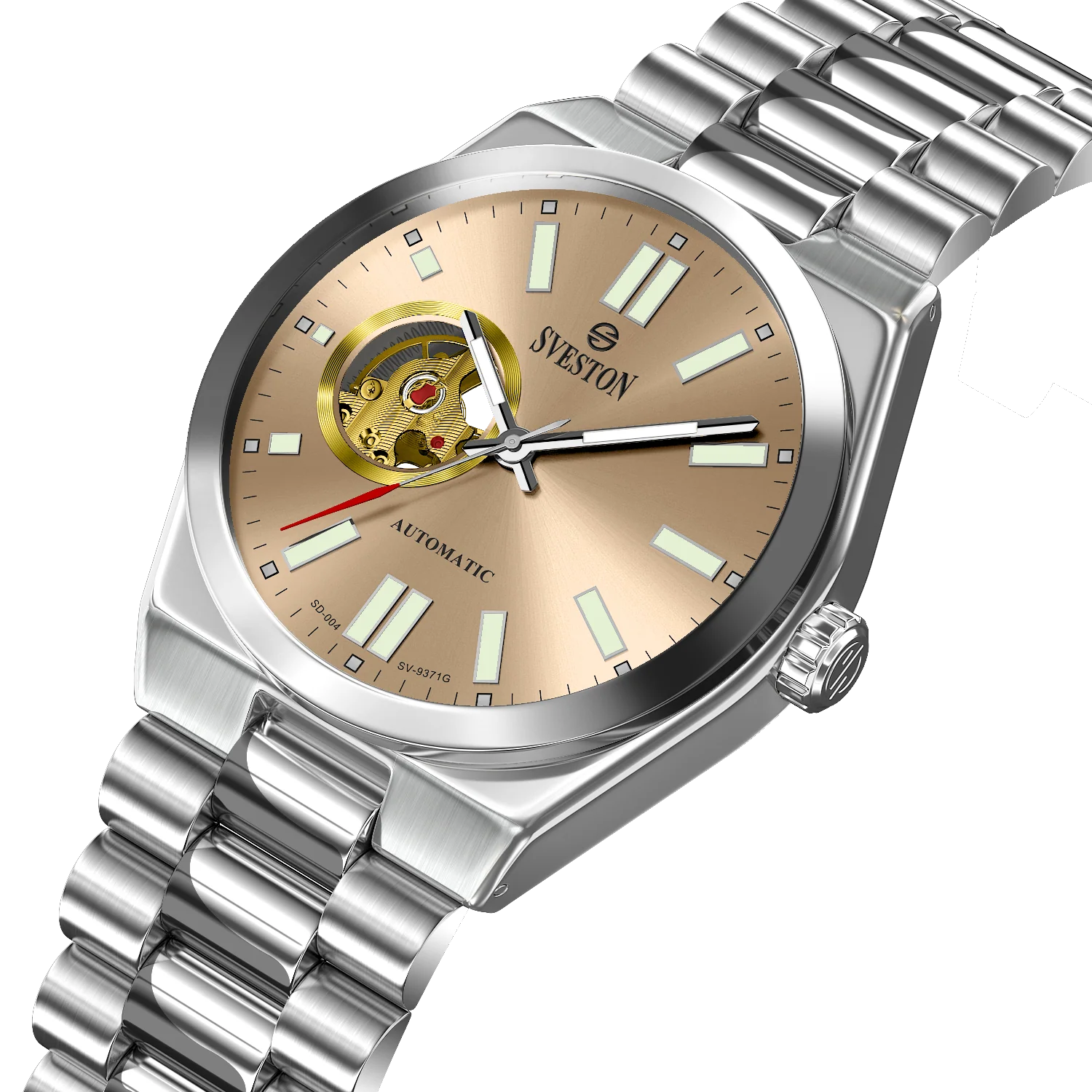 Discover timeless elegance with the Sveston Automatic Silver Watch, featuring a stunning golden dial and a visible skeleton mechanism that showcases precision craftsmanship. Built with a durable stainless-steel strap, this men’s watch combines luxury style with automatic movement for unmatched sophistication. Perfect for both formal occasions and daily wear, this Sveston watch elevates your wrist game effortlessly.