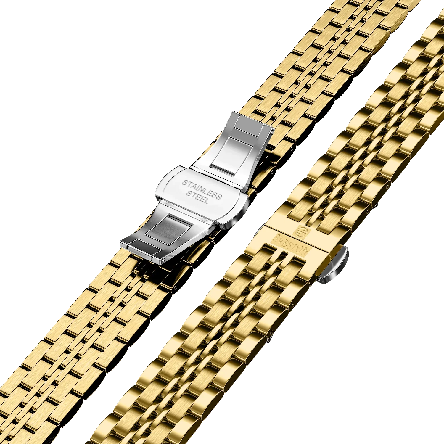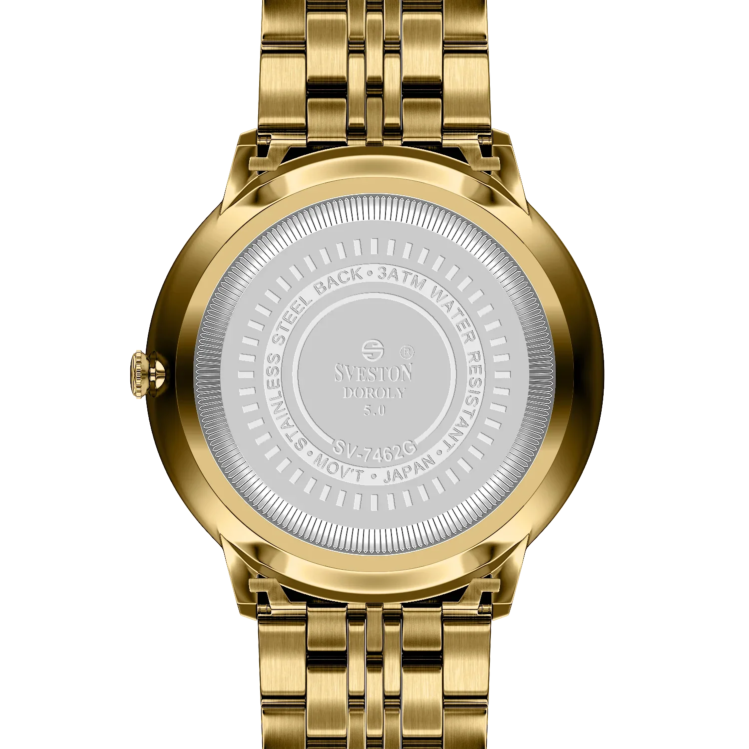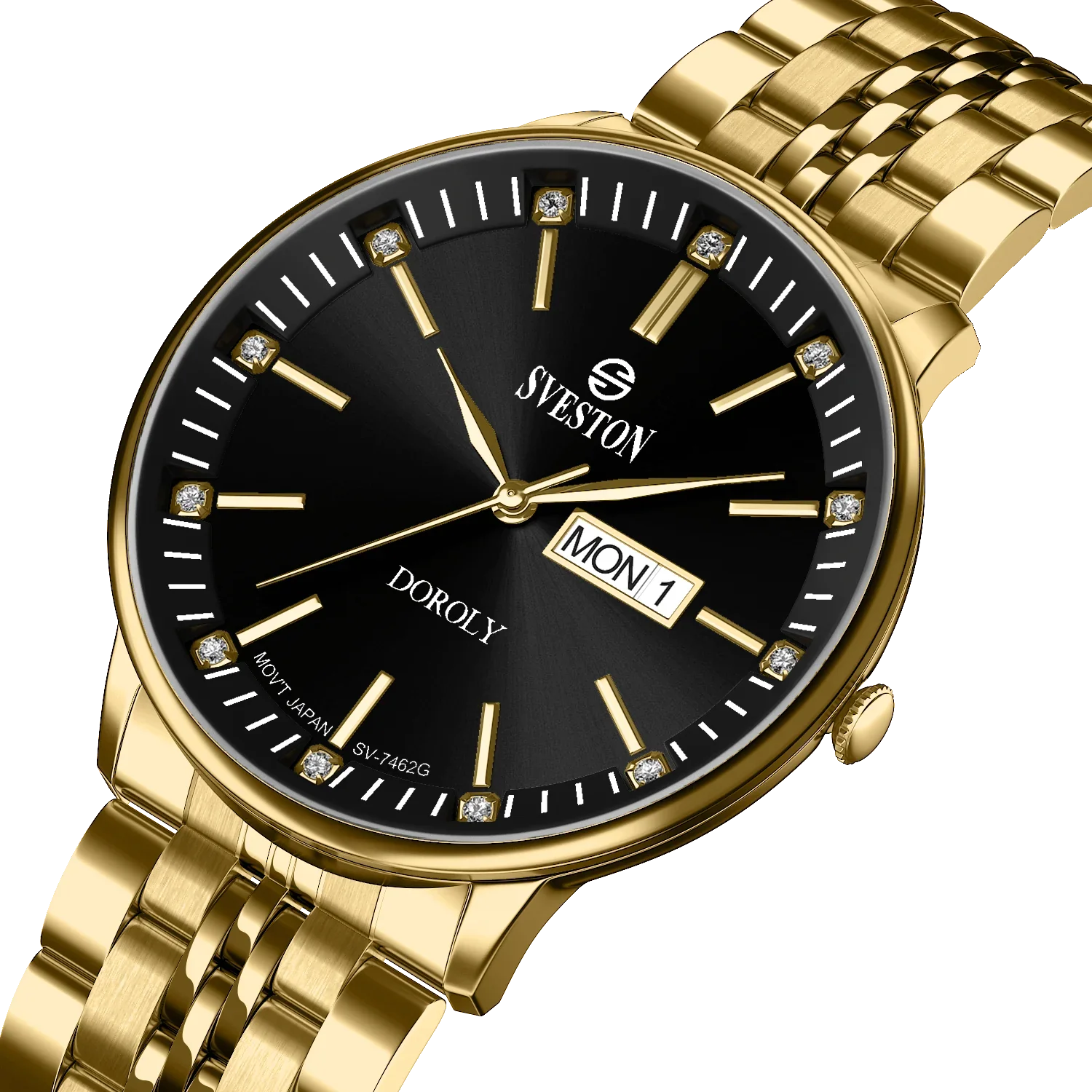 Elevate your style with the Sveston Doroly Gold Watch, featuring a bold black dial, crystal hour markers, and a premium gold stainless-steel bracelet. Designed for the modern man, this watch blends sophistication and performance with Japanese quartz movement and a day-date display. Perfect for formal occasions or daily wear, the Sveston Doroly defines timeless luxury.