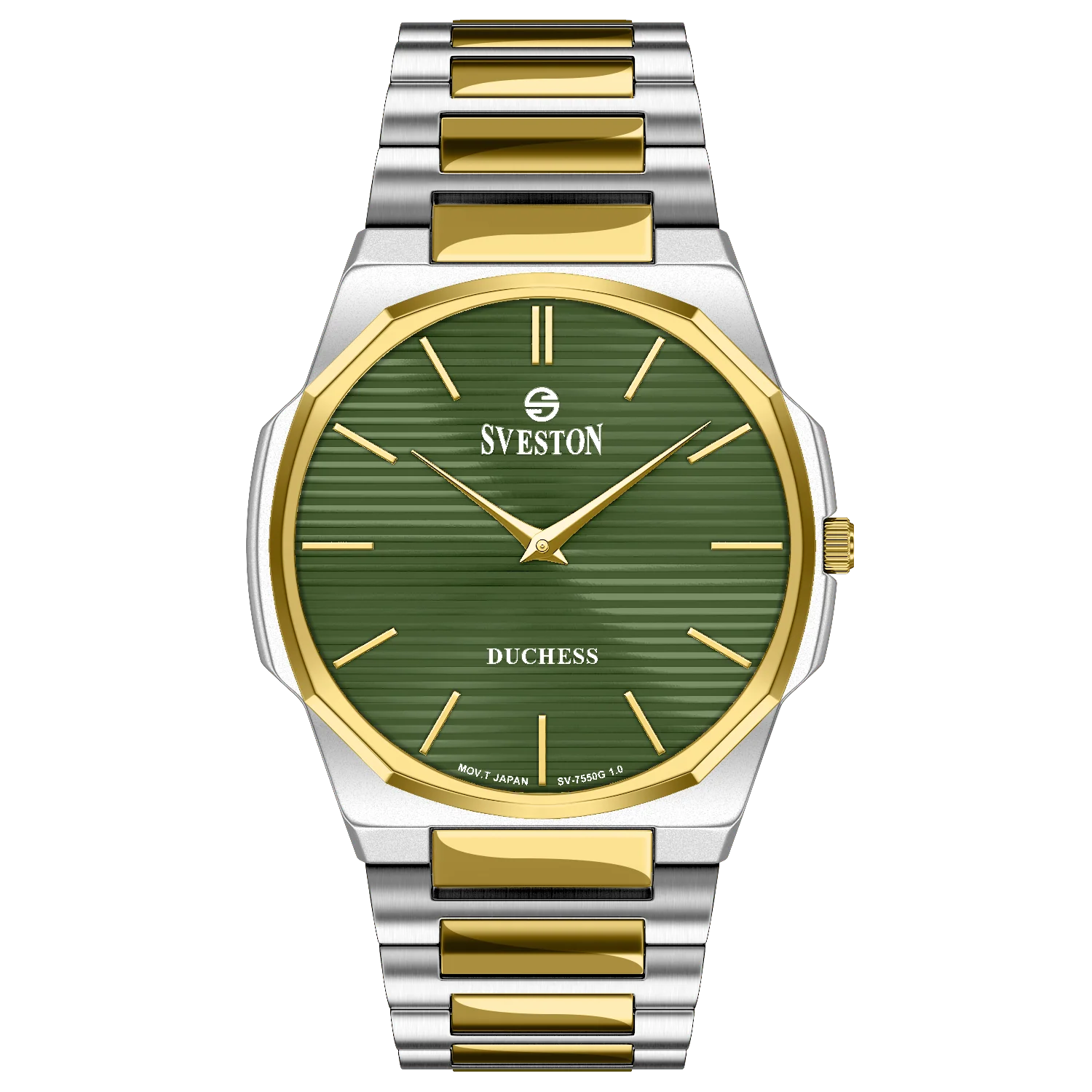 Add a touch of luxury to your look with the Sveston Duchess Green Dial Watch, crafted with a two-tone gold and silver stainless-steel strap and a bold green textured dial. Featuring reliable Japanese movement and elegant minimal design, this timepiece defines sophistication, confidence, and modern class — perfect for every occasion.