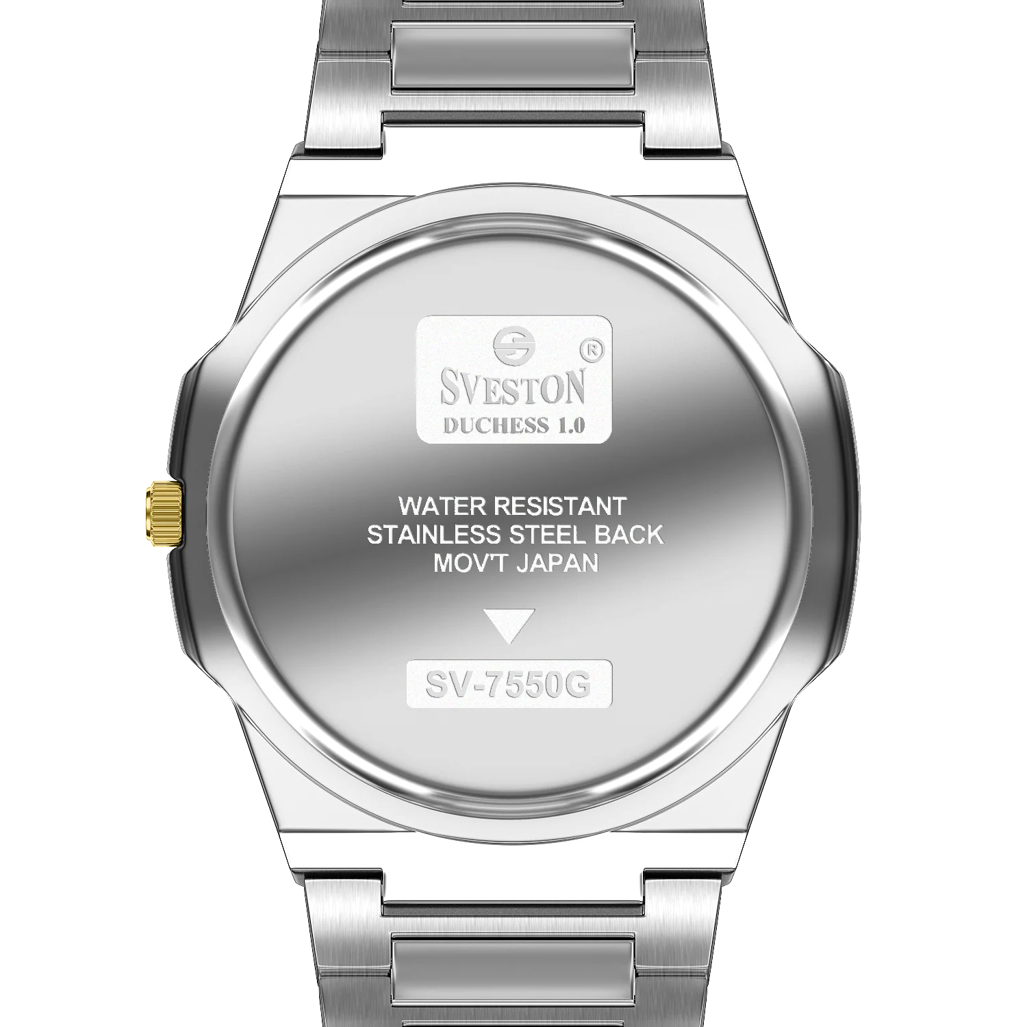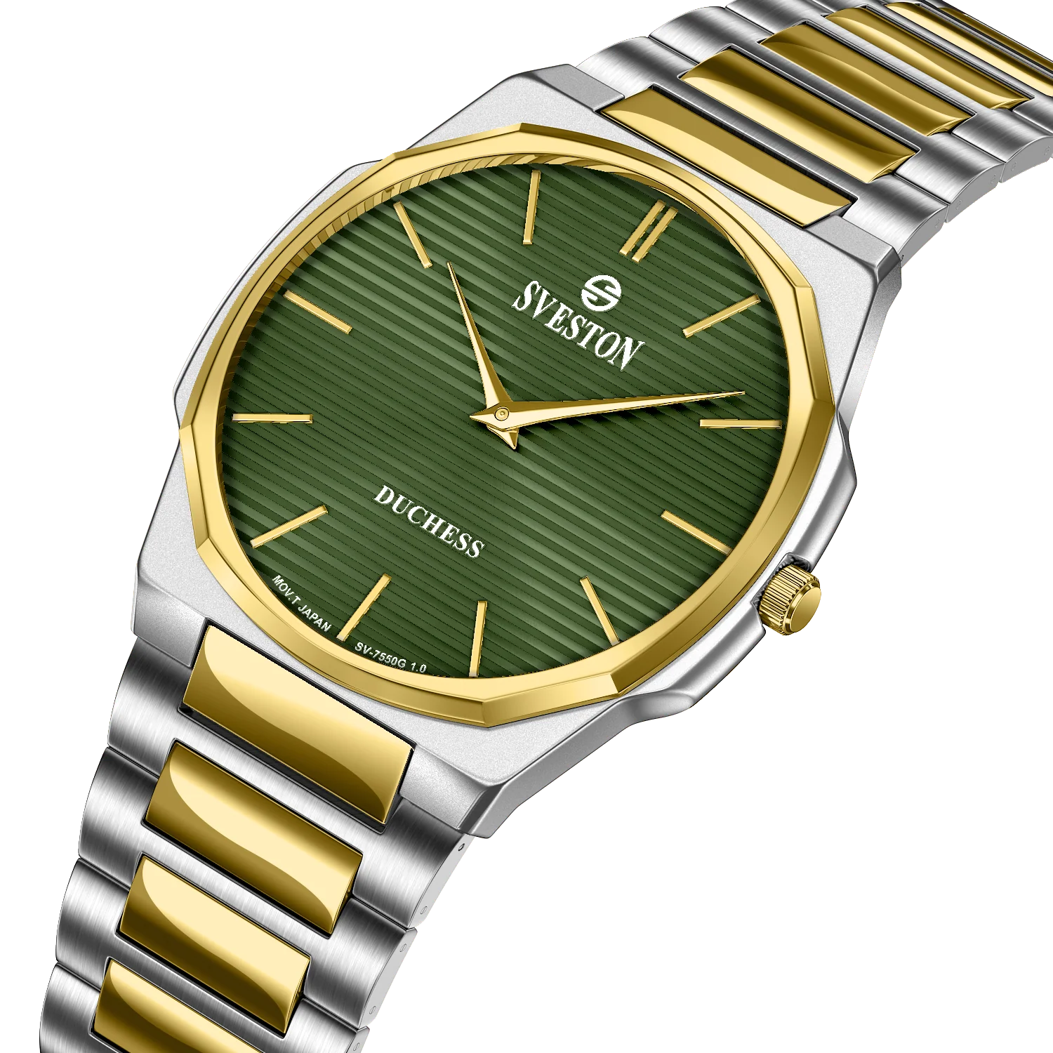 Make a bold style statement with the Sveston Duchess Green Dial Watch, featuring a rich emerald green textured dial and a stunning two-tone gold and silver stainless-steel strap. Crafted with Japanese movement precision, this elegant timepiece blends luxury, confidence, and timeless charm — perfect for modern women with refined taste.