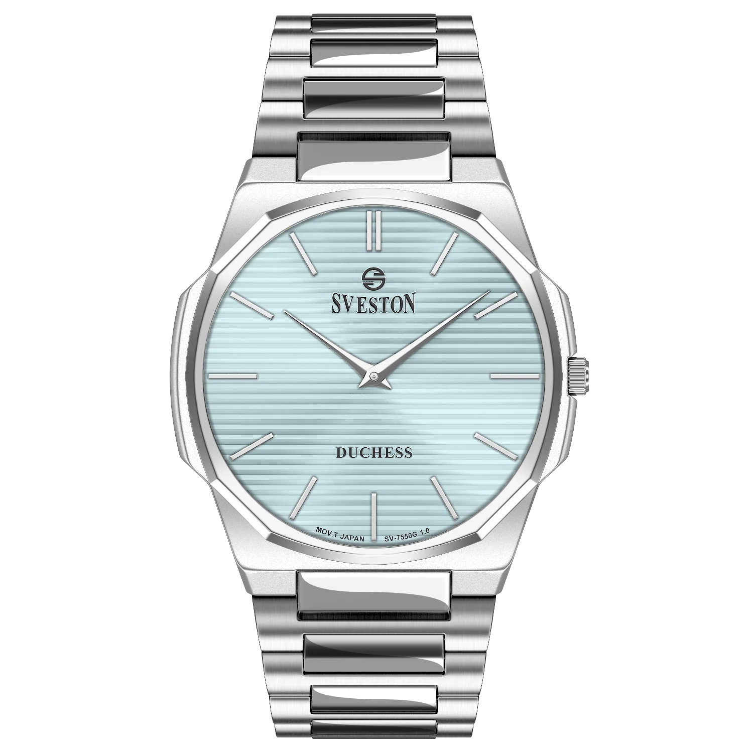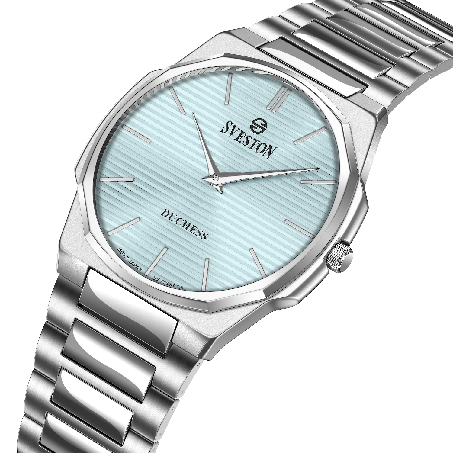 Elevate your style with the Sveston Duchess Sky Blue Dial Watch, a masterpiece of sophistication and grace. Featuring a serene sky-blue textured dial, sleek silver stainless-steel strap, and reliable Japanese quartz movement, this watch perfectly balances modern elegance with timeless beauty. Ideal for women who appreciate luxury and minimalism in every detail.