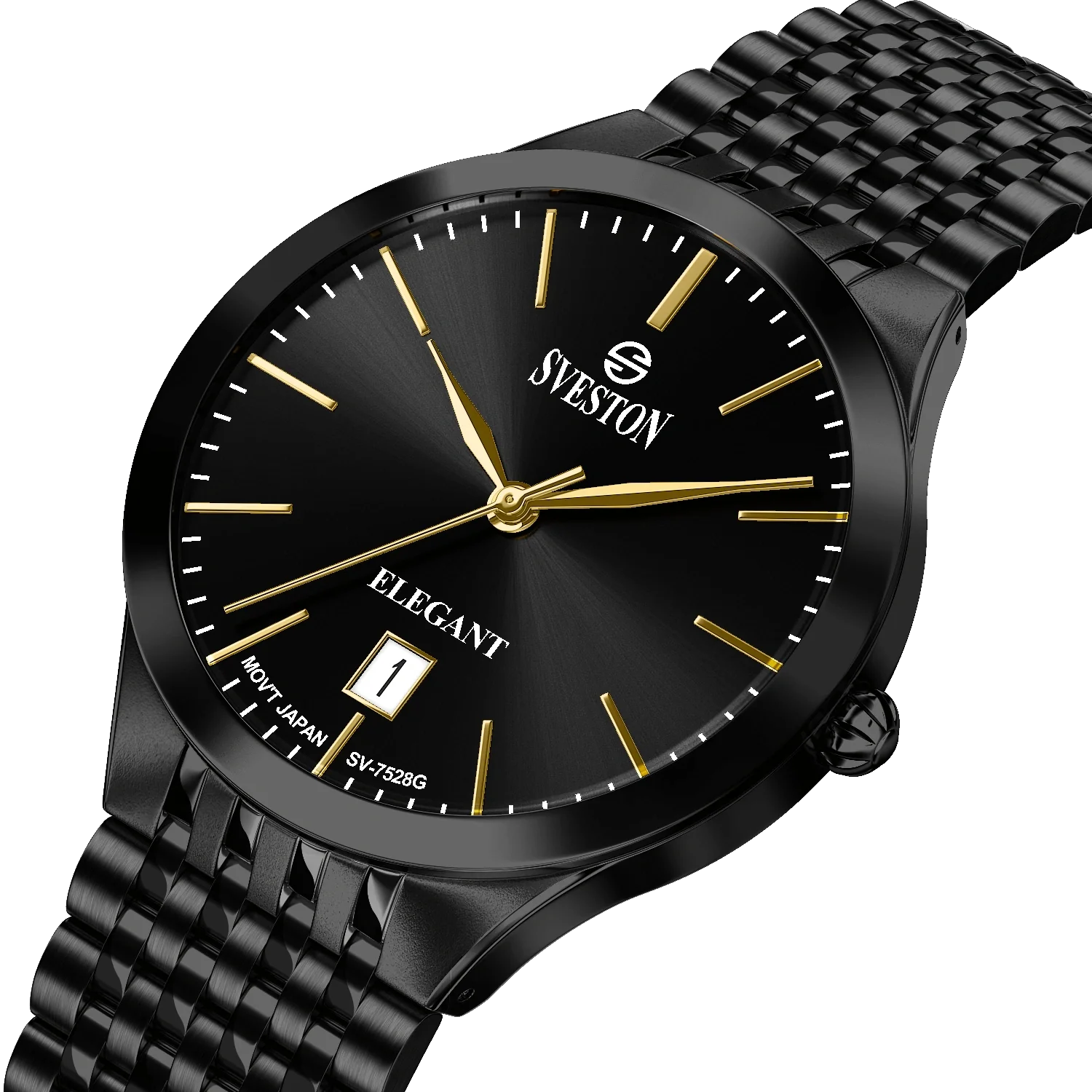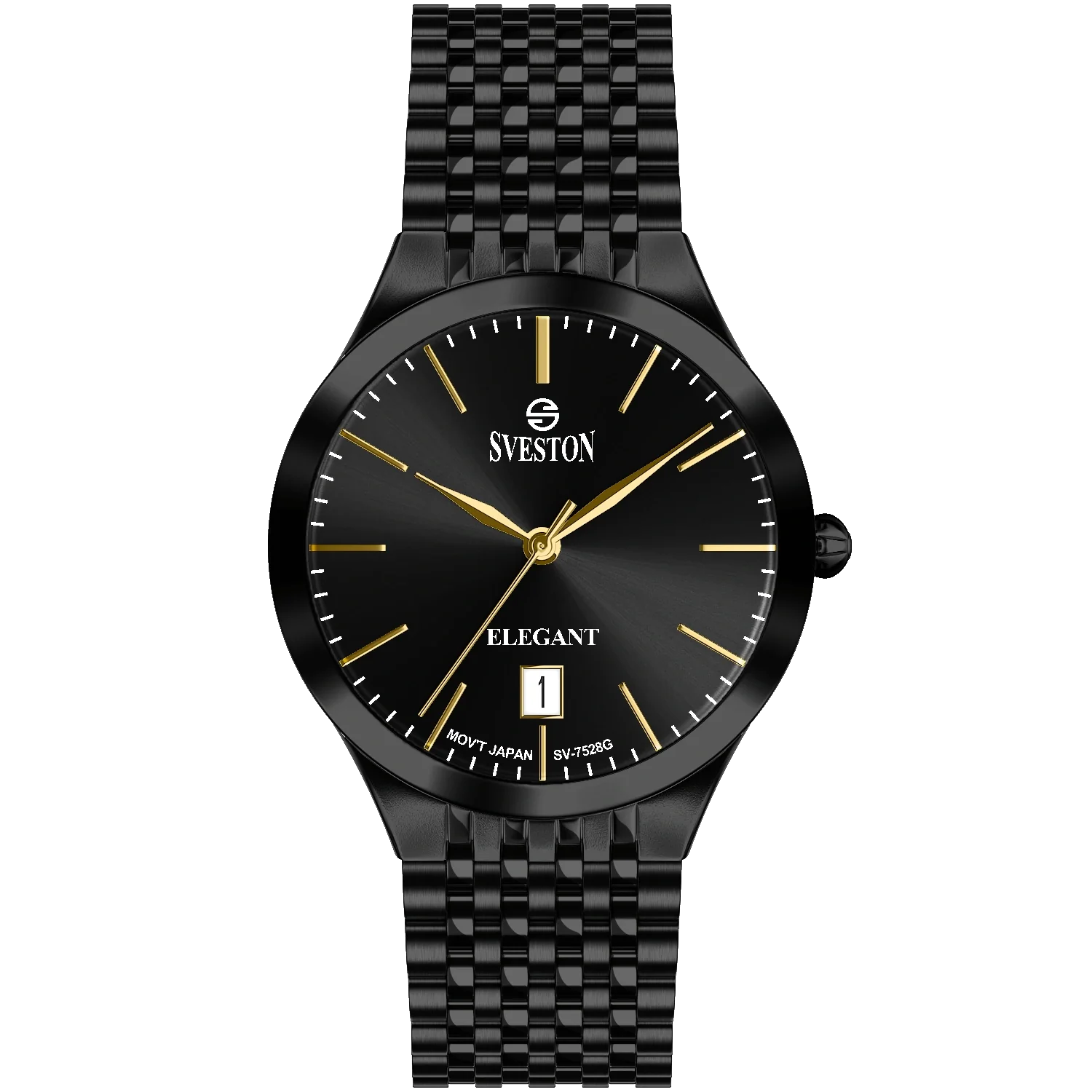 The Sveston Elegant SV-7528G in all-black redefines sophistication and confidence. Featuring a sleek black dial with gold accents, and a durable black stainless steel strap, this timepiece perfectly blends modern design with timeless elegance. Powered by Japanese quartz movement, it ensures precision and style for every moment. Ideal for both formal attire and casual wear, this watch is a true symbol of bold elegance.