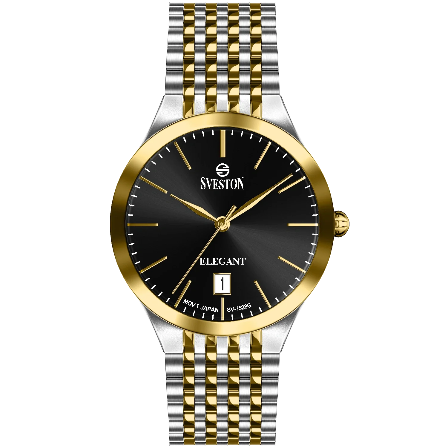 Redefine timeless sophistication with the Sveston Elegant SV-7528G, a masterpiece of precision and luxury. This men’s watch features a striking black sunray dial, two-tone silver and gold stainless-steel bracelet, and a bold date display for a refined look. Perfect for formal occasions or daily wear, the Sveston Elegant combines minimal design with a premium aesthetic — the perfect companion for the modern gentleman.