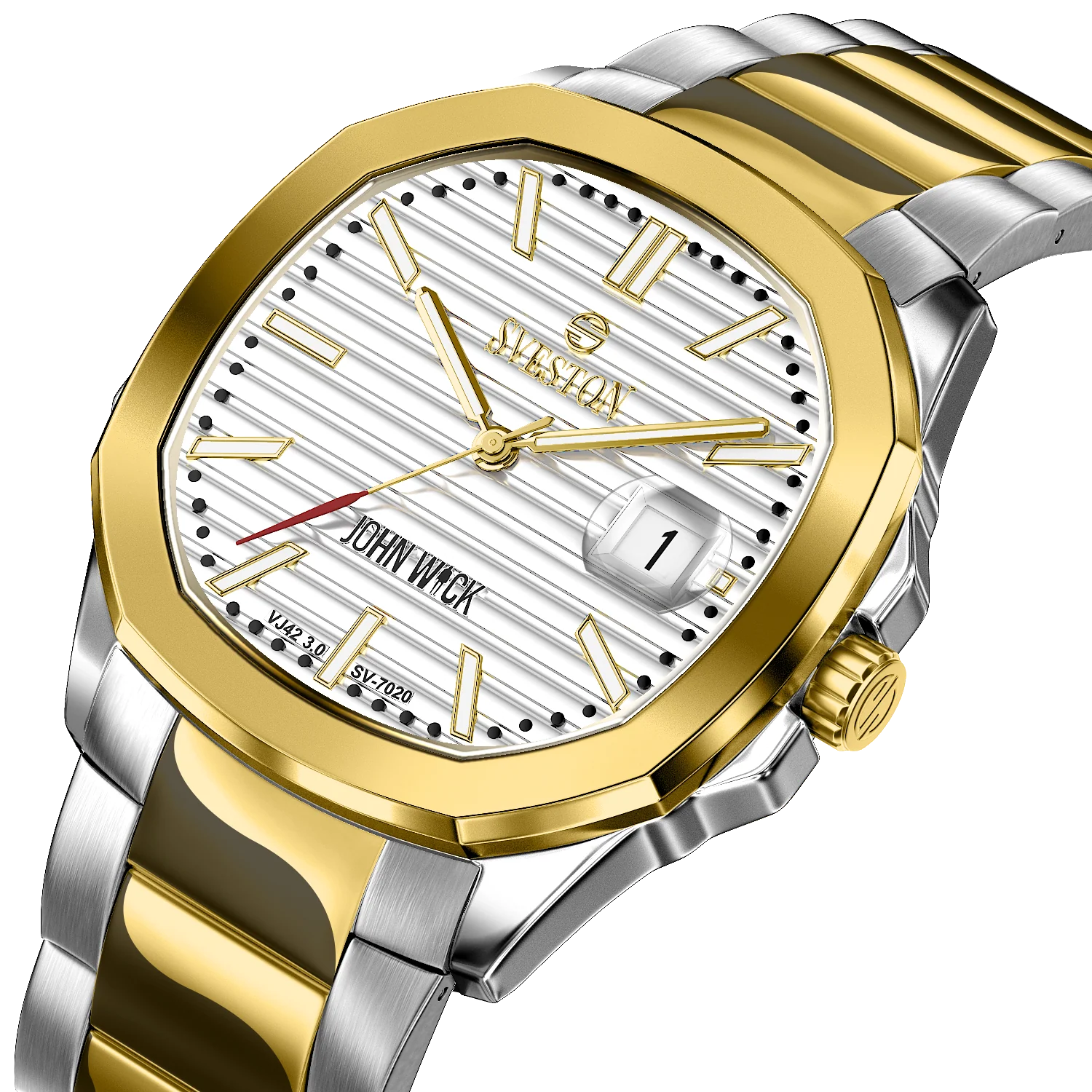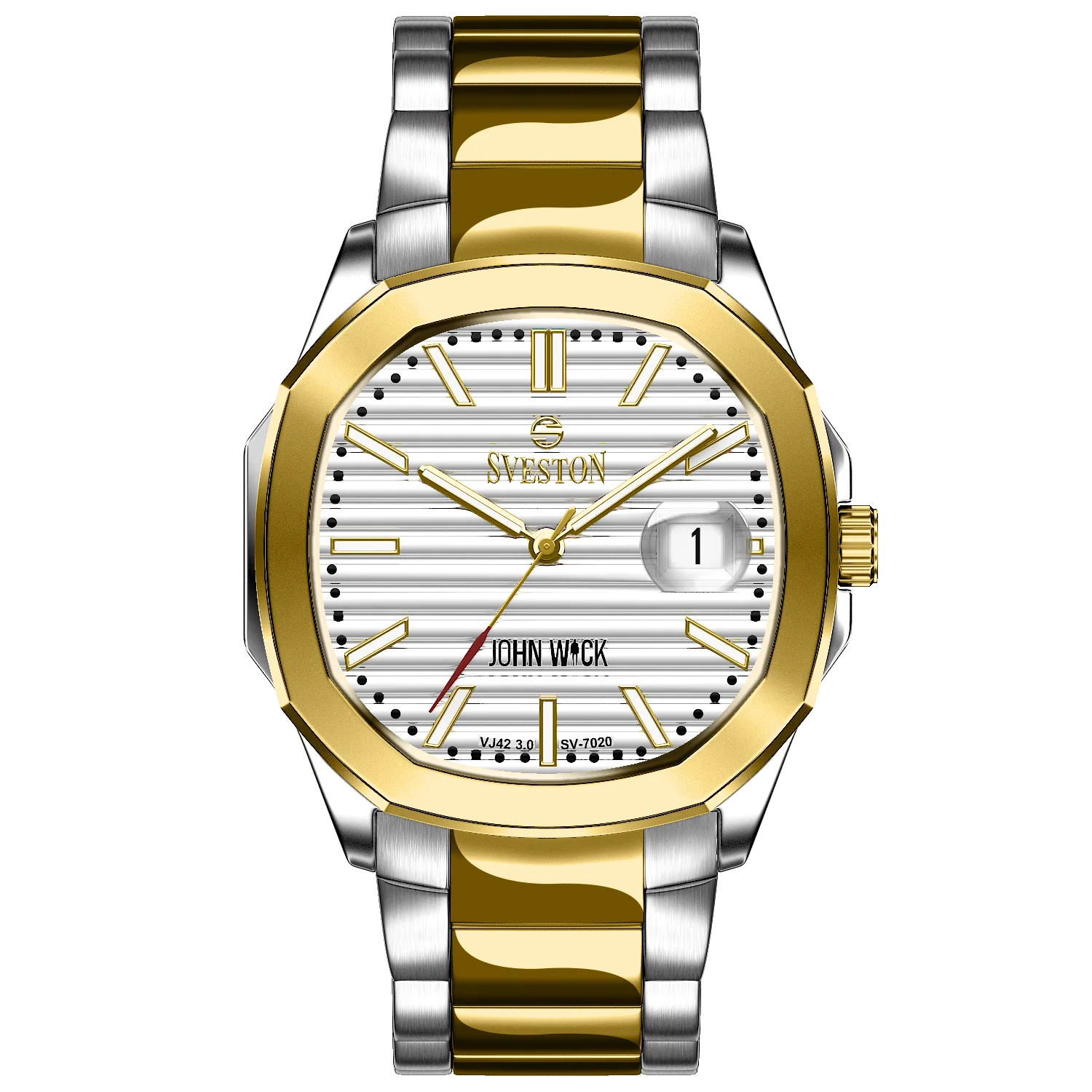 Experience timeless elegance with the Sveston John Wick Two-Tone Gold & Silver Watch, a masterpiece that blends luxury with precision. Featuring a white textured dial with golden hour markers and a dual-tone stainless-steel bracelet, this timepiece captures sophistication at every glance.