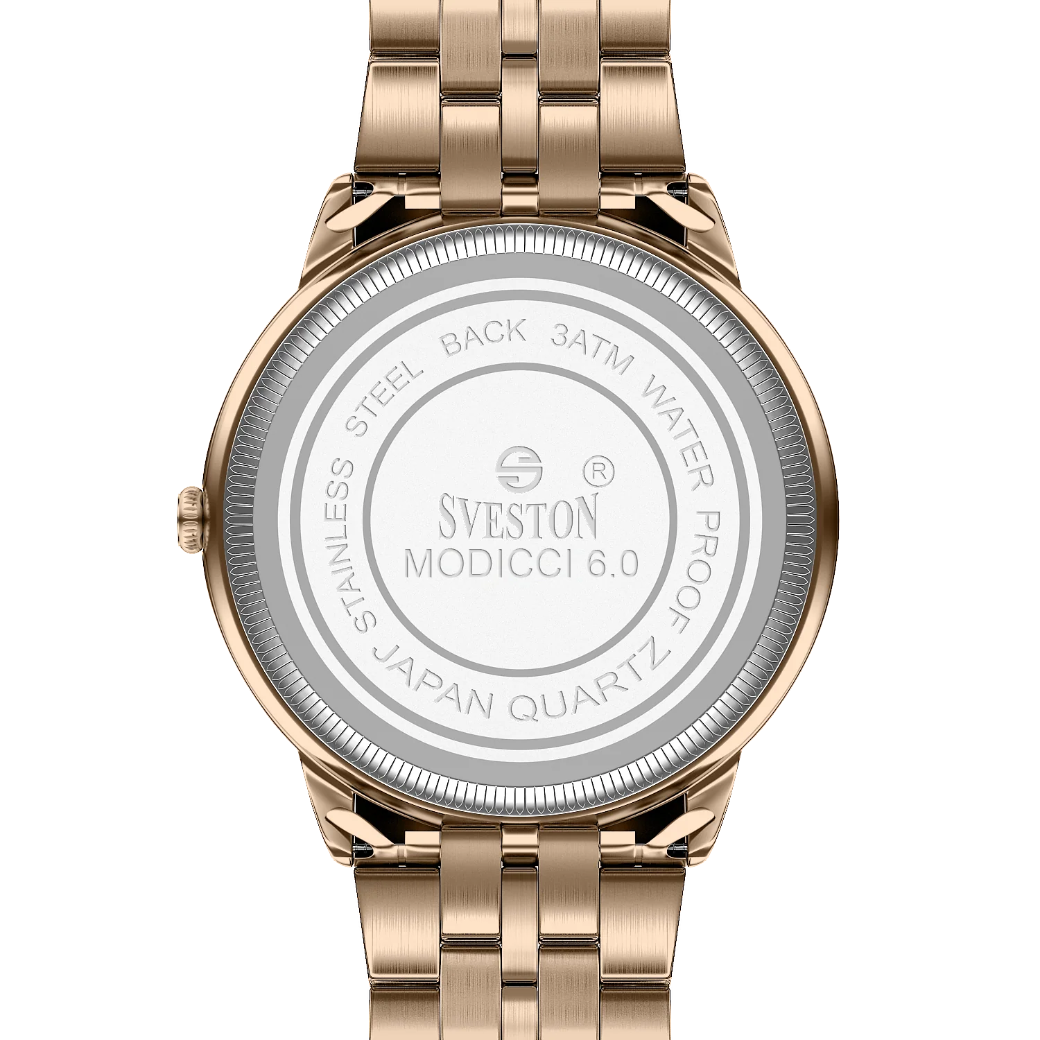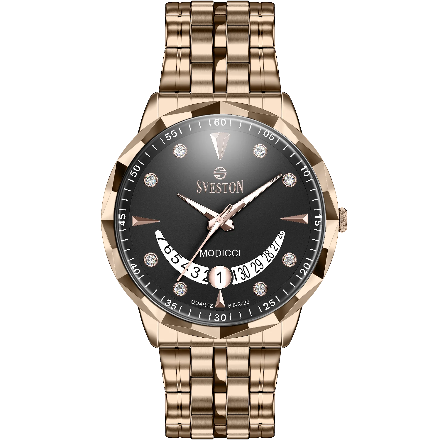 Add a touch of timeless sophistication with the Sveston Modicci Rose Gold Watch. Featuring a bold black dial adorned with crystal hour markers, this watch pairs elegance with precision. The polished rose gold stainless steel bracelet and unique curved date display make it a standout accessory for every occasion. Powered by reliable Japanese quartz movement, the Modicci collection redefines modern luxury with confidence and style.
