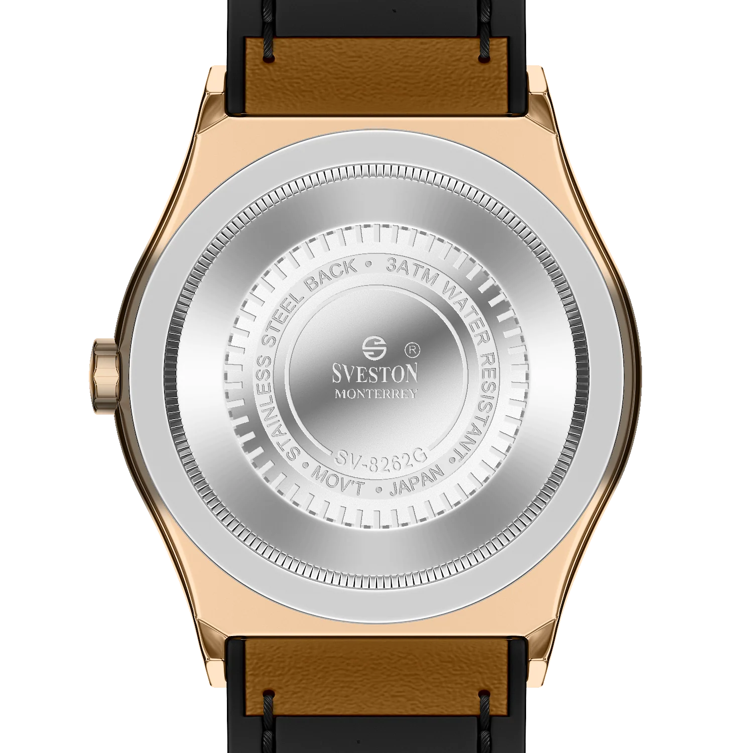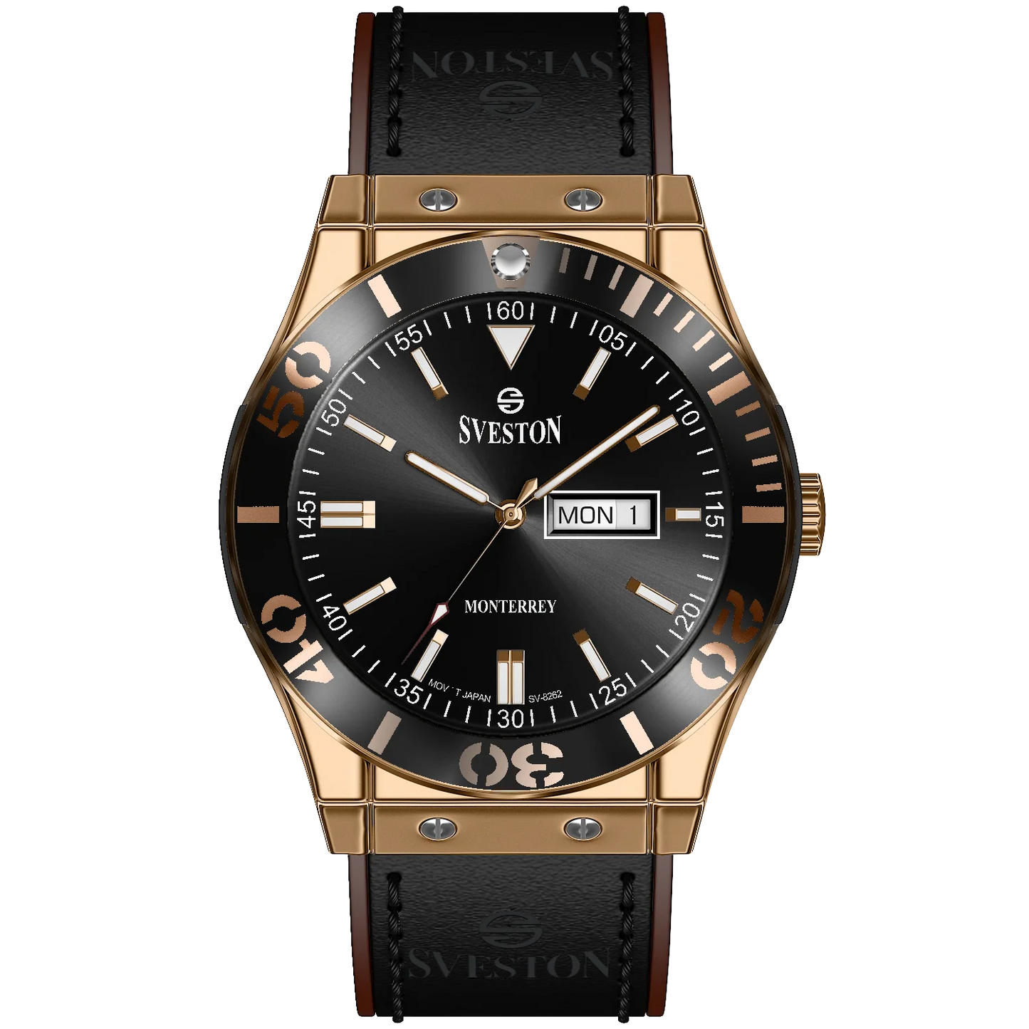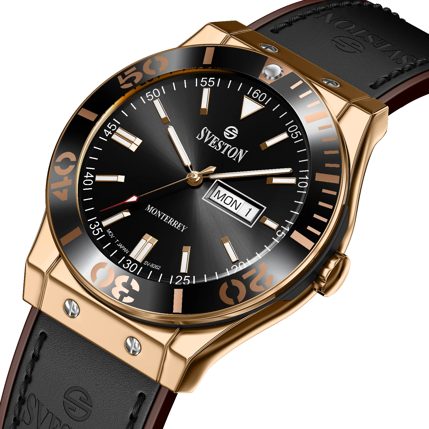 The Sveston Monterrey Rose Gold Black Watch redefines elegance with a modern edge. Featuring a stunning rose gold stainless steel case, a sleek black dial, and a premium leather strap, this watch is designed for men who appreciate timeless sophistication. The precise Japanese movement ensures accuracy, while the day-date feature adds practical charm. Whether paired with formal wear or smart casuals, this timepiece reflects confidence, class, and craftsmanship.