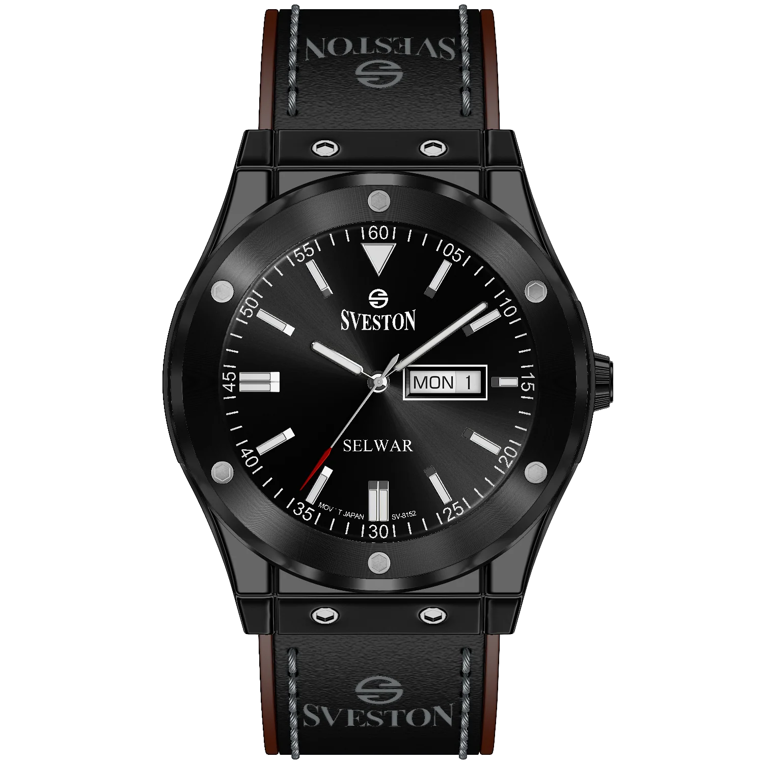 Unleash your bold style with the Sveston Selwar Black Watch, a perfect fusion of power and sophistication. Crafted with a striking black dial, durable stainless steel case, and premium leather strap, this watch embodies timeless elegance. The precise Japanese movement and functional day-date display make it both stylish and reliable. Ideal for formal events or everyday wear, the Sveston Selwar is designed for men who appreciate confidence, precision, and luxury in every detail.