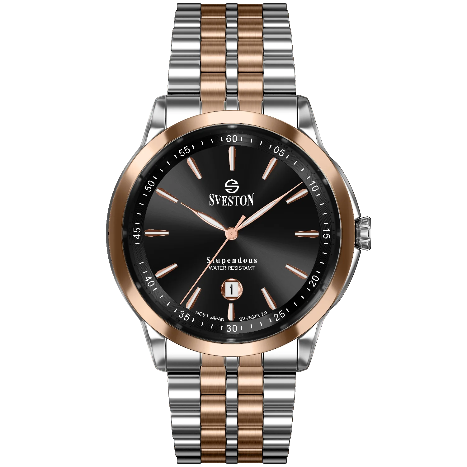 Discover timeless elegance with the Sveston Supendous Black & Rose Gold Watch, designed for men who appreciate refined style and precision. This luxury wristwatch features a sleek black dial, rose gold accents, and a two-tone stainless steel bracelet for a modern yet classic look. Equipped with Japanese quartz movement and a date display, it combines durability, sophistication, and everyday functionality. Perfect for both formal and casual wear, the Supendous adds confidence to every outfit.