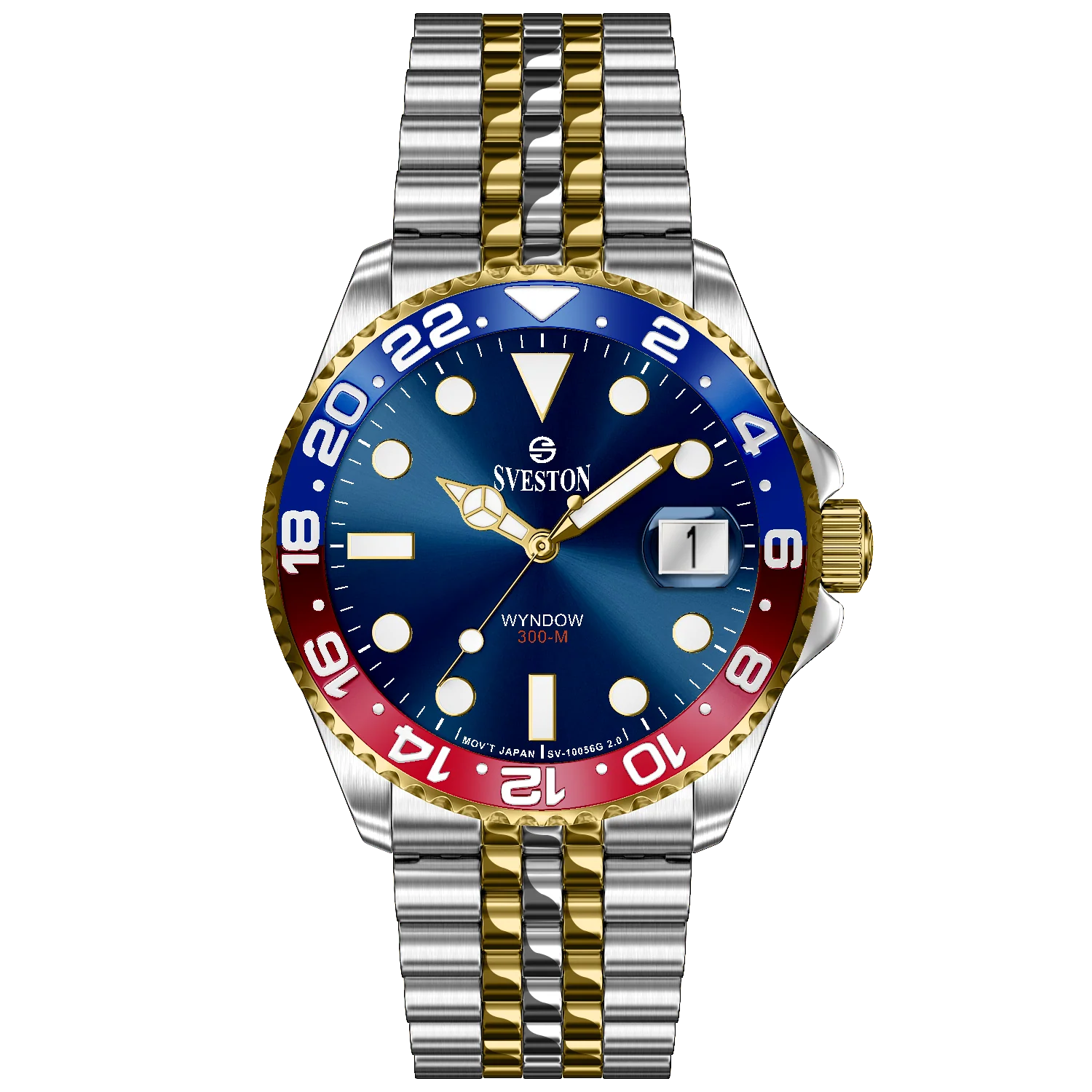Elevate your style with the Sveston Wyndow 300-M Blue Dial GMT Watch, a symbol of luxury and precision. Featuring a stunning blue sunburst dial, Pepsi-style red and blue bezel, and elegant two-tone stainless-steel bracelet with gold detailing. Powered by a reliable Japanese movement and 300M water resistance, this watch blends performance with timeless sophistication — perfect for modern men who demand excellence.