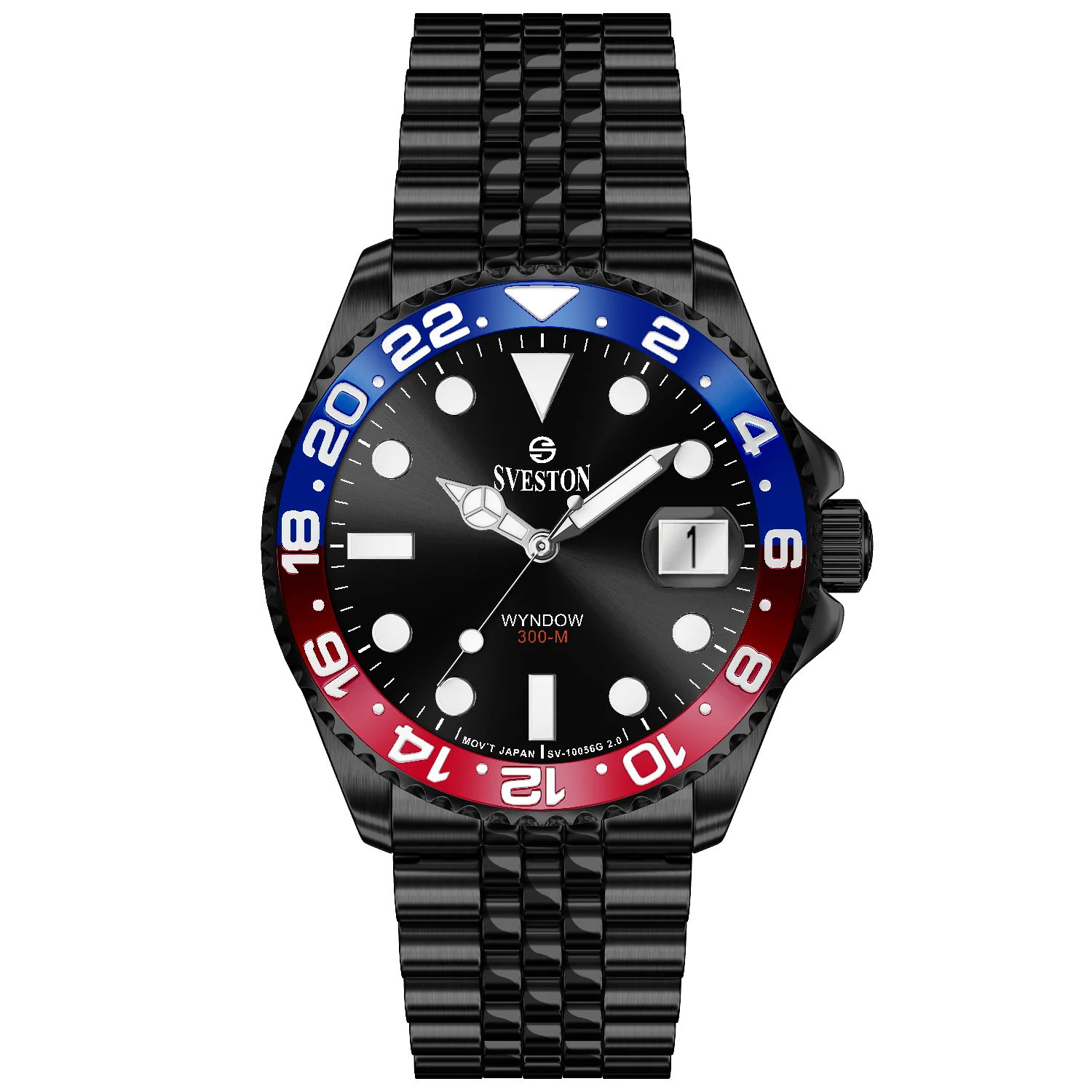 Elevate your wrist game with the Sveston Wyndow 300-M, a bold GMT watch designed for men who value precision and power. Featuring a striking blue-and-red dual-tone bezel, luminous dial markers, and a durable black stainless steel bracelet, this timepiece combines sportiness with sophistication. Powered by reliable Japanese movement, it’s water-resistant and crafted to complement both casual and formal looks — the perfect blend of functionality and modern luxury.